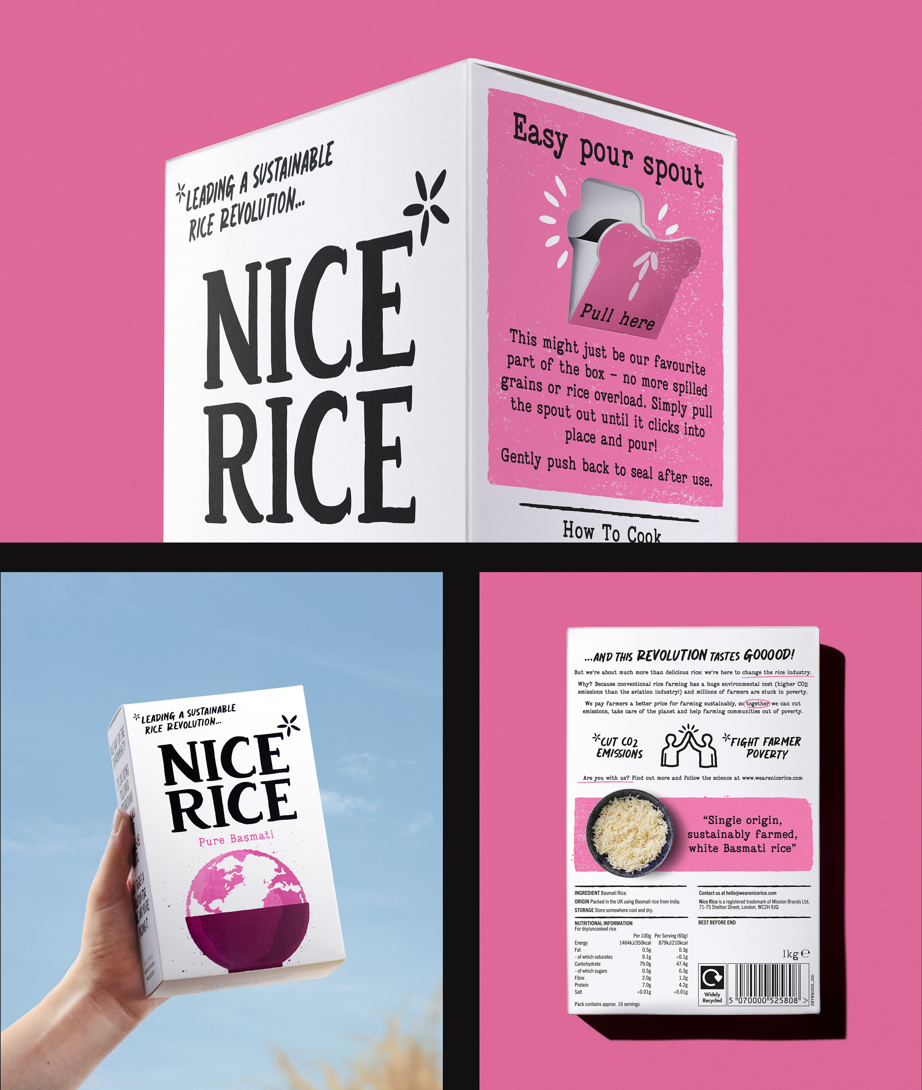 The company’s founder, Fergus O’Sullivan came to us after he’d left his job; he’d had got to a point where he wanted to start a business that made a difference to the world. He’d identified that the growth and production of rice is detrimental to the environment and has the second highest emissions of any food after beef. These gases are produced from the traditional way of growing rice in a paddy and there is, in fact, a more sustainable way of growing rice in a field. However, because the supply chains and the setup are so well established, Farmers are reluctant to change over to this newer method. Fergus came to us with this idea for a rice brand which ended up being called “Nice Rice”; the name captured the spirit of the product in a ‘non-preachy’ way, making it accessible. The Founder wanted the brand to be disruptive, with market leaders being Tilda and Ben’s and he wanted to offer a better way of buying rice that thoughtfully supports the environment and tastes great.